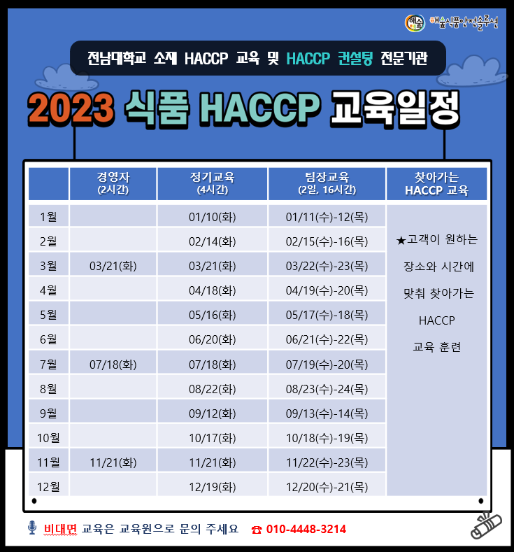 | 9월 | HACCP 정기 과정 | 23.09.12(화) | 13:00-17:00 | ||||